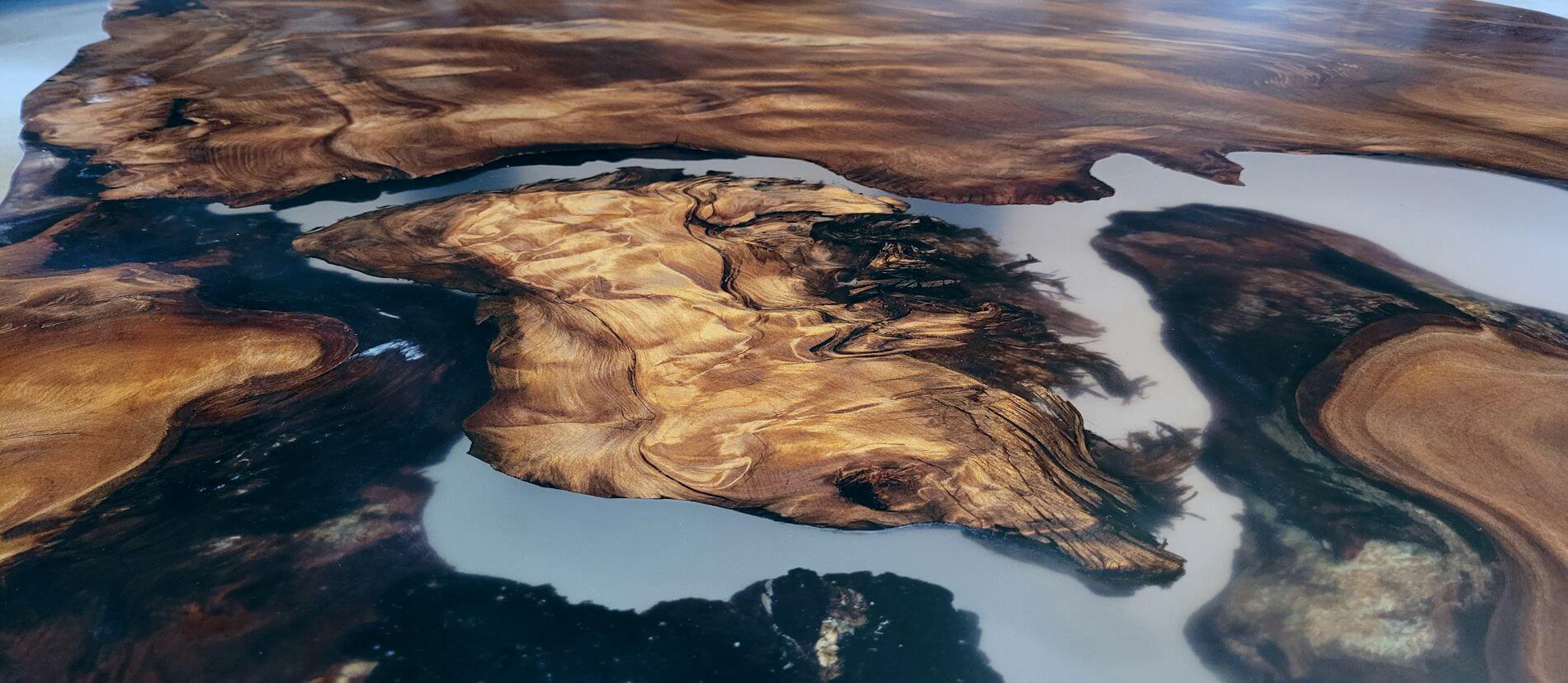 In this table, a long, natural opening in the center was transformed into a riverbed using transparent epoxy resin. The result is a serene dining table with a unique material effect.